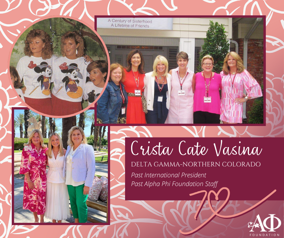 Today, we are honoring a sister whose leadership has touched nearly every corner of our organization: Crista Cate Vasina (Delta Gamma–Northern Colorado).Crista’s journey is a beautiful blueprint for what it means to lead with a “Vibrant Heart.” Serving as International President from 2002 to 2006, she led Alpha Phi during a historic milestone—the 100th anniversary of the National Panhellenic Conference (NPC). As one of the seven founding members of the NPC in 1902, Alpha Phi’s leadership during this centennial was a powerful reminder of our role as a “first” and a pioneer in the Greek world, ensuring our voice remained at the forefront of the fraternal movement.From the Presidency to the FoundationWhat makes Crista’s legacy truly unique is how her leadership transitioned from the Fraternity to the Foundation. After completing her term as International President, her passion for the Alpha Phi experience led her to a new role: joining the Alpha Phi Foundation staff.Crista brought her deep institutional knowledge and love for the Fraternity to the Foundation to help direct the Leading With Heart campaign. This ambitious effort was designed to secure the future of our sisterhood by funding our highest priorities, and Crista’s guidance was instrumental in its success. She moved from setting the vision as President to ensuring the resources were there to sustain it.Defining “What Alpha Phi Should Be”Throughout her years of service, Crista has always been a voice for excellence. She famously authored messages to the sisterhood about “What Alpha Phi Should Be,” focusing on evolving our standards for a new millennium while staying rooted in our core values.Whether she was leading from the President’s podium or working behind the scenes at the Foundation to empower the next generation of donors, Crista has remained a steadfast champion for every Alpha Phi. Her story reminds us that there are countless ways to serve, and that a “Vibrant Legacy” is built one act of devotion at a time.