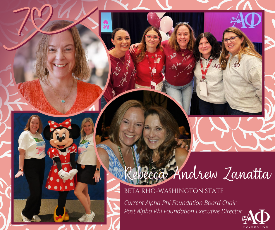 As we move forward in our countdown and near the end of Women’s History Month, we are celebrating a sister whose career and volunteerism have been dedicated to the art and science of giving: Rebecca Andrew Zanatta (Beta Rho–Washington State).Rebecca’s journey with Alpha Phi is a powerful example of how professional expertise and sisterhood combine to create a “Vibrant Legacy.” A seasoned philanthropic consultant and nonprofit leader, Rebecca has spent her career helping organizations find their “why” – a skill set she has generously poured back into Alpha Phi Foundation in nearly every capacity possible.From Executive Director to Board ChairWhat makes Rebecca’s leadership so unique is her 360-degree perspective of our mission. Before her time on the Board, she served as the Executive Director of Alpha Phi Foundation, where she managed the daily operations and growth of our philanthropic programs.In 2022, she transitioned back into a top leadership role as the Chair of the Alpha Phi Foundation Board of Directors, a position she holds today. This rare combination of staff and volunteer leadership has given her a deep, personal understanding of how every gift transforms the Alpha Phi experience.A Strategic Vision for Our FutureUnder Rebecca’s guidance, the Foundation isn’t just growing; it’s strategically advancing. She has been a primary architect of the 2024–2027 Strategic Plan, a bold roadmap designed to ensure the Foundation remains agile, forward-thinking, and responsive to the evolving needs of our sisters. As Rebecca recently shared, this plan is more than a document – it is a testament to the strength of our leadership and a collaborative effort to secure a vibrant future for every member.Investing in the “Most Impactful Version” of OurselvesRebecca views every gift to the Foundation not just as a donation, but as a thoughtful investment in cultivating the next generation of leaders and changemakers.“It’s about giving every Alpha Phi the tools to give back and to become the most impactful version of herself,” Rebecca notes.Her legacy is one of “Exceptional and Innovative Leadership,” proving that when we bring our professional talents to our volunteer roles, we don’t just sustain the organization—we transform it into a catalyst for triumph.