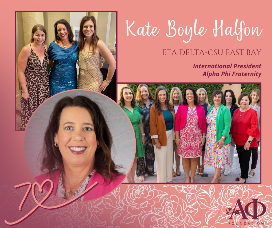 Today, we are honoring a sister who stands at the very heart of our organization’s leadership: Kate Boyle Halfon (Eta Delta–CSU East Bay).As our current International President, Kate’s dedication to Alpha Phi is more than just a title – it is a lifelong commitment to the women who make up our sisterhood. While she leads the Fraternity with vision and grace, she is also a loyal donor and a passionate advocate for the Alpha Phi Foundation, understanding that the strength of our sisterhood is inextricably linked to the generosity that fuels our mission.A Foundation for LeadershipFor Kate, giving back is a way of honoring the “excellent training” she received as both a collegian and an alumna. She credits Alpha Phi with molding her into the leader she is today, providing the strategies and confidence she uses in her professional and personal life.“Most of my strategies for leadership I have learned through excellent training both as a collegiate and alumnae member and so that is why I continue to give back,” Kate shares. “I want other women to feel empowered and to be strong, effective leaders in their communities.”A Partnership for ProgressKate is a champion for the powerful synergy between the Fraternity and the Foundation. She envisions a future where our “Vibrant Legacy” is defined by a deep, creative collaboration that reaches even more members. By investing in the Foundation, Kate is ensuring that every Alpha Phi has access to the high-quality programming and leadership opportunities that defined her own journey.Her leadership reminds us that when the Fraternity and the Foundation work hand-in-hand, we don’t just provide a membership – we provide a launchpad for “Limitless Excellence.”