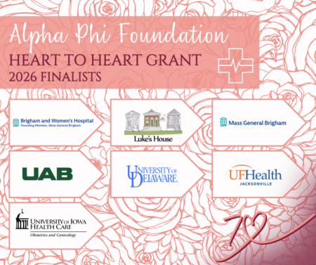 Alpha Phi Foundation recognizes seven finalists for the 2026 Heart to Heart Grant. This year we received a record breaking 87 applications for our 33rd year of the Heart to Heart Grant. Our finalists represent the institutions who most closely aligned with the Alpha Phi Foundation’s mission, and we are blown away by all the important work they are doing in women’s cardiac research. A special thank you to our volunteer Medical Readers and Heart to Heart Grant Advisory Council for all your time and guidance. Our top seven finalists are from the following institutions: Brigham and Women’s Hospital – AI Driven Mammographic Screening for Cardiovascular Risk Prediction in Women Mission: Brigham and Women’s Hospital (BWH), a founding member of Mass General Brigham and a teaching affiliate of Harvard Medical School, is dedicated to advancing human health through excellence in patient care, biomedical research, medical education, and community service. With a mission to deliver compassionate, world-class care to every patient; pioneer transformative discoveries that improve health outcomes globally; train the next generation of healthcare leaders; and address health disparities in underserved populations, BWH integrates cutting-edge science with clinical innovation across more than 150 specialty areas. Annually serving over 1.5 million patient visits and conducting nearly $1 billion in sponsored research, the institution remains committed to its founding vision of providing high-quality, accessible care while pushing the boundaries of medical knowledge to benefit patients today and for generations to come. Website: https://www.brighamandwomens.org/ Luke’s House: A Clinic for Healing and Hope- Expanding Early Detection and Health Education for Peripheral Arterial Disease (PAD) Among Underserved Women in Greater New Orleans Mission: Luke’s House Clinic is a free, bilingual, volunteer-run teaching clinic that provides compassionate, culturally responsive healthcare to uninsured and underserved families in New Orleans. We are committed to removing barriers to care, offering all services at no cost and never requiring ID or insurance. Our mission is to be a place of medical hope, health, and healing, to provide patient-centered educational experiences for students, and to open a doorway to long-term healthcare solutions. Website: https://www.lukeshouseclinic.org/ Massachusetts General Hospital – Menopause Related Hot Flashes and Cardiovascular Health: The Role of Endothelial Inflammation Mission: Mass General Brigham (MGB), formerly known as Partners Healthcare, is an integrated health system composed of 14 hospital systems and their affiliated clinics and practices caring for 1.5 million patients annually. MGB’s mission is to enhance patient care, advance medical research, and educate the next generation of healthcare professionals, all while serving and improving the health of the communities they serve. Massachusetts General Hospital (MGH) is one of the two major academic medical centers, along with Brigham and Women’s Hospital (BWH), anchoring MGB. MGH and BWH both represent teaching hospitals for Harvard Medical School in Boston. BWH is located adjacent to Harvard Medical School (HMS) and the Harvard School of Public Health (HSPH), less than 4 miles from MGH. Frequent shuttles provide transportation between MGH and BWH. The two hospitals share a common medical record and computing system (EPIC) as well as a common IRB, facilitating collaboration. MGH is a not-for-profit medical center. Its mission is to deliver the best healthcare in a safe compassionate environment, to advance that care through innovative research and education; and to improve the health and well-being of the communities served by the MGH. Founded in 1811, MGH is the third oldest general hospital in the United States and the oldest and largest hospital in New England. MGH employs over 10,000 individuals in both professional and other support positions, and it has a long and rich tradition of excellence in clinical research. Website: http://www.massgeneral.org/ University of Alabama at Birmingham – Postpartum Heart: Alabama Womb2 Heart Solution- A Randomized Controlled Trial Mission: UAB enriches society and improves health and well-being through transformational educational experiences, groundbreaking research, innovation and entrepreneurship, community engagement, and world-class patient care while serving our UAB, local and global communities. Website: http://www.uab.edu University of Delaware – Time Restricted Eating Among Emerging Adult Women: A Single- Armed Mechanistic Clinical Trial Mission: The University of Delaware exists to cultivate learning, develop knowledge, and foster the free exchange of ideas. State-assisted yet privately governed, the University has a strong tradition of distinguished scholarship, which is manifested in its research and creative activities, teaching, and service, in line with its commitment to increasing and disseminating scientific, humanistic, artistic, and social knowledge for the benefit of the larger society. Founded in 1743 and chartered by the state in 1833, the University of Delaware today is a land-grant, sea-grant, and space-grant university. The University of Delaware is a major research university with extensive graduate programs that is also dedicated to outstanding undergraduate and professional education. UD faculty are committed to the intellectual, cultural, and ethical development of students as citizens, scholars and professionals. UD graduates are prepared to contribute to a global and diverse society that requires leaders with creativity, integrity and a dedication to service. The University of Delaware promotes an environment in which all people are inspired to learn, and encourages intellectual curiosity, critical thinking, free inquiry, and respect for the views and values of an increasingly diverse population. An institution engaged in addressin